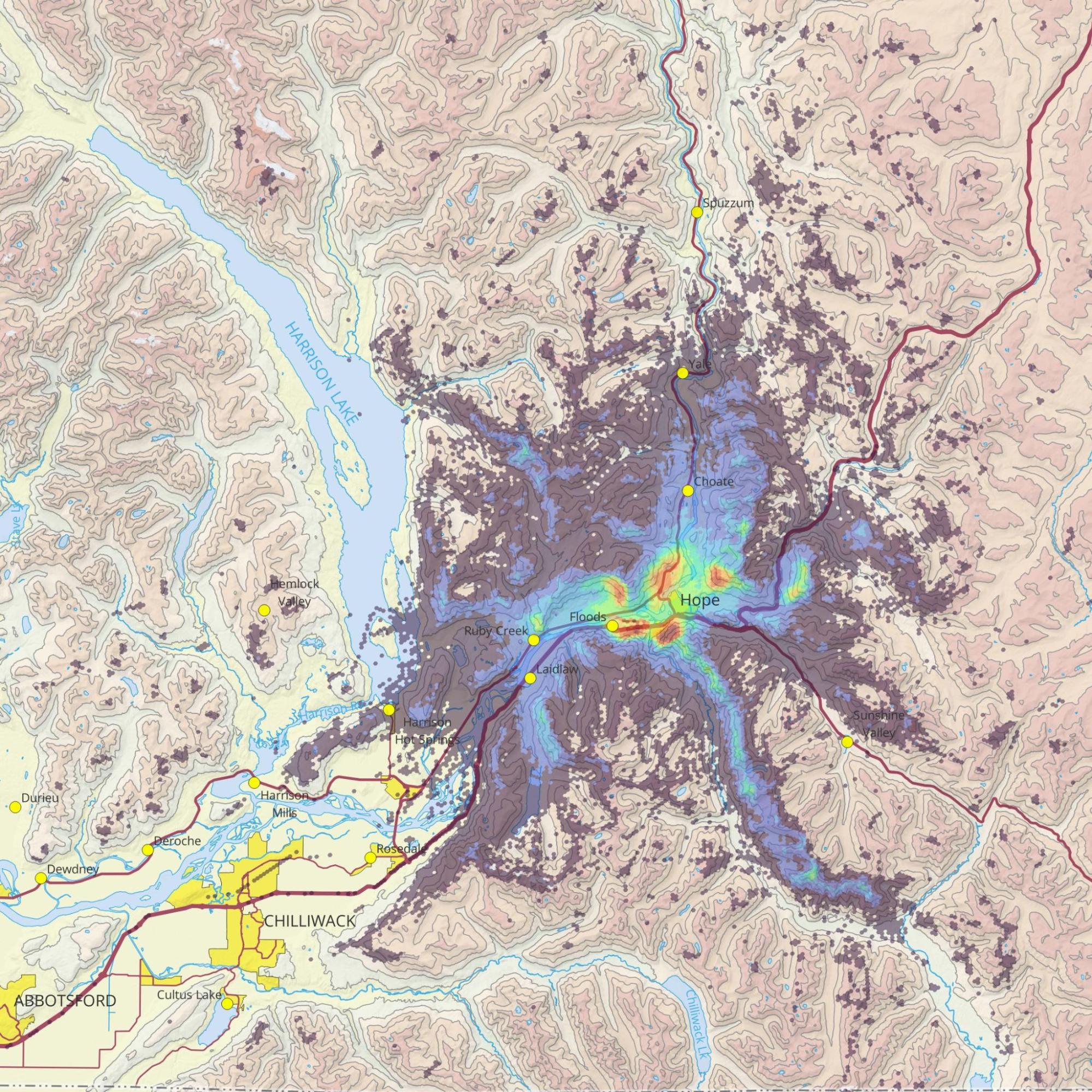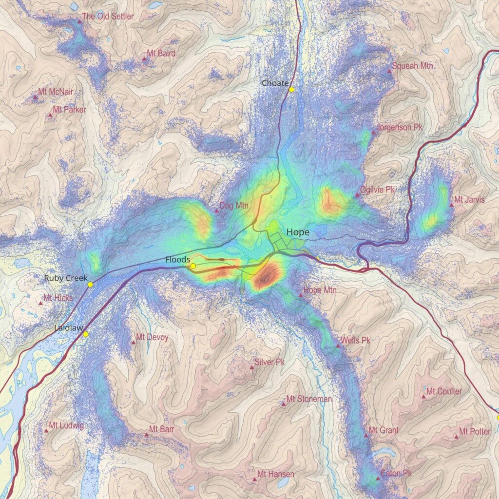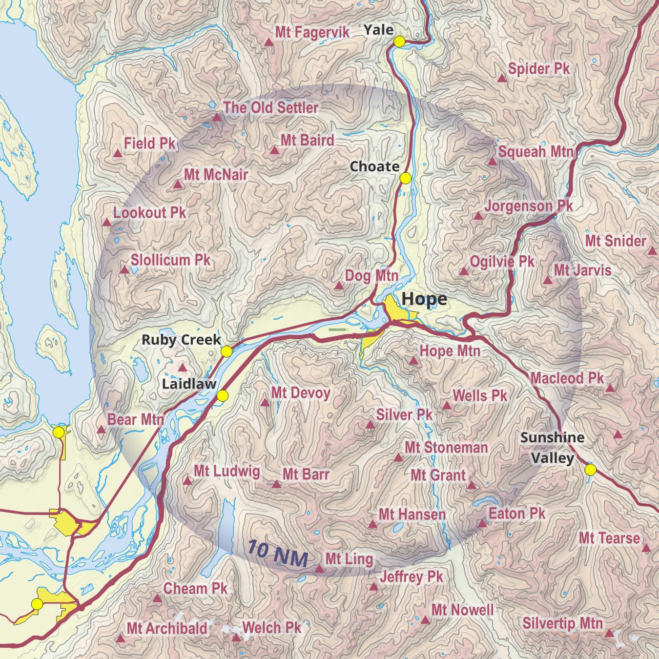 The majority of our flying takes place within 5 NM of CYHE and up to 4,000 ft ASL. These include basic training flights, familiarization flights, and flights by glider pilots who we have not yet been approved to fly cross-country. On a typical west wind day, gliders commonly fly along the northwest face of Hope Mountain, in and along “The Bowl” to the west of Dog Mountain, and along the south and west aspects around Ogilvie Peak.