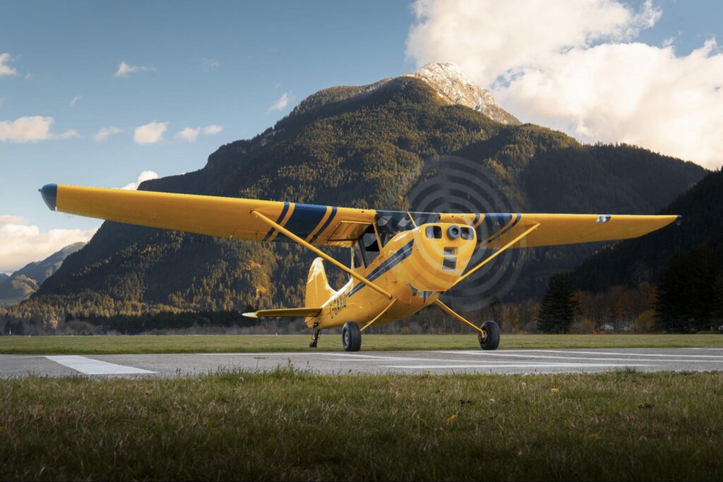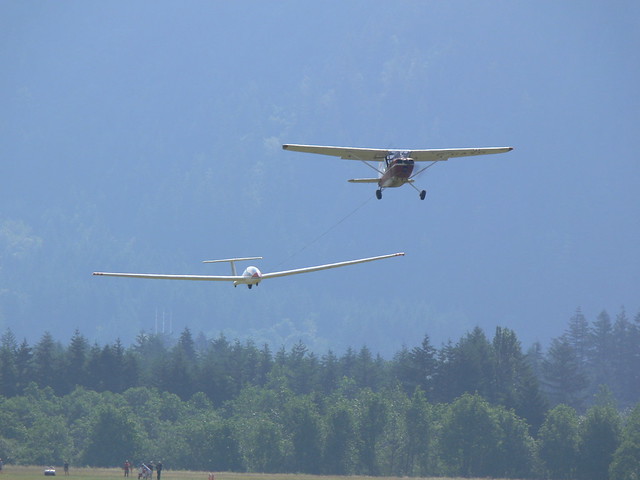 We operate two yellow Cessna L-19 tow planes to launch gliders: C-FAUJ and C-GAXQ. Only one of these tail-draggers is usually operational on any given day. A tow rope 200 feet-long hangs from the tail of the tow planes with metal rings on the end. If you see a tow plane flying around CYHE, check for gliders on tow behind it and also in free flight. Only one of our tow planes is equipped with a transponder.
