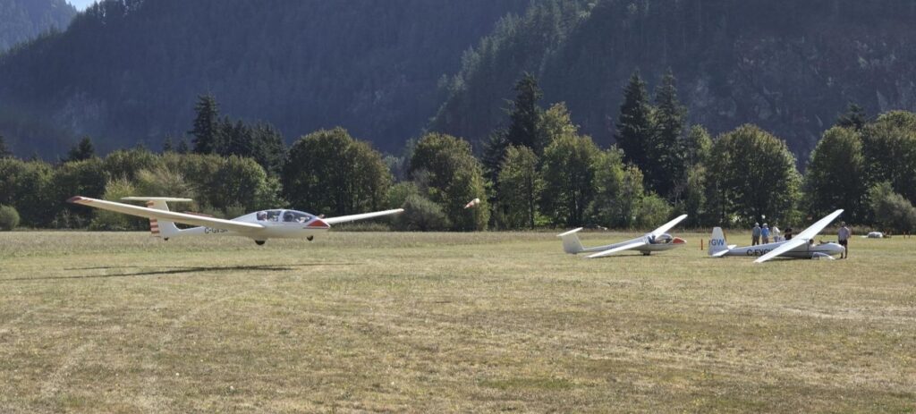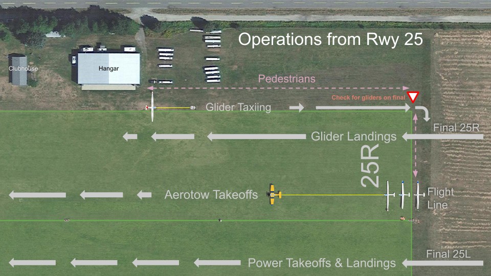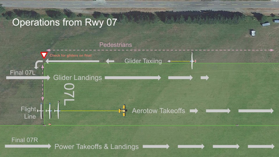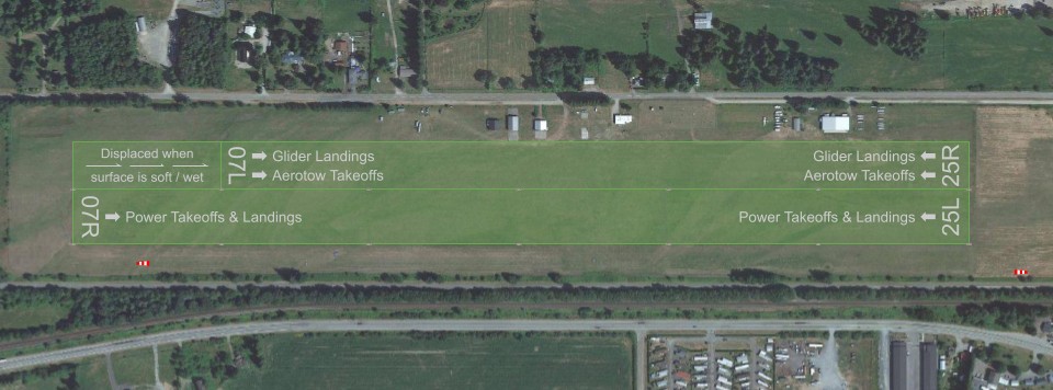 Gliders stage, take-off, and land on the north of the marked runway at CYHE, which we call “Runway 25R” or “07L”. Take-offs are just north of the power runway, and landings north of that. Pedestrians are asked to stay as far north as practical, and cross directly across from the flight line after checking for gliders (which are silent) on final approach. We ask power traffic to be mindful of our operating area when taxiing and stopping.