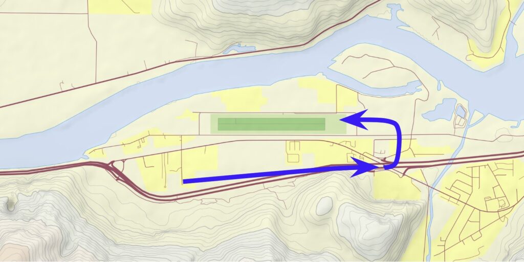 Gliders enter downwind at 1,000 to 1,200 ft ASL about 2,000 ft alongside the runway and turn base about one-half mile from the runway threshold around 700 ft ASL. Downwinds for Runway 25 typically angle slightly towards the runway to keep clear of terrain.