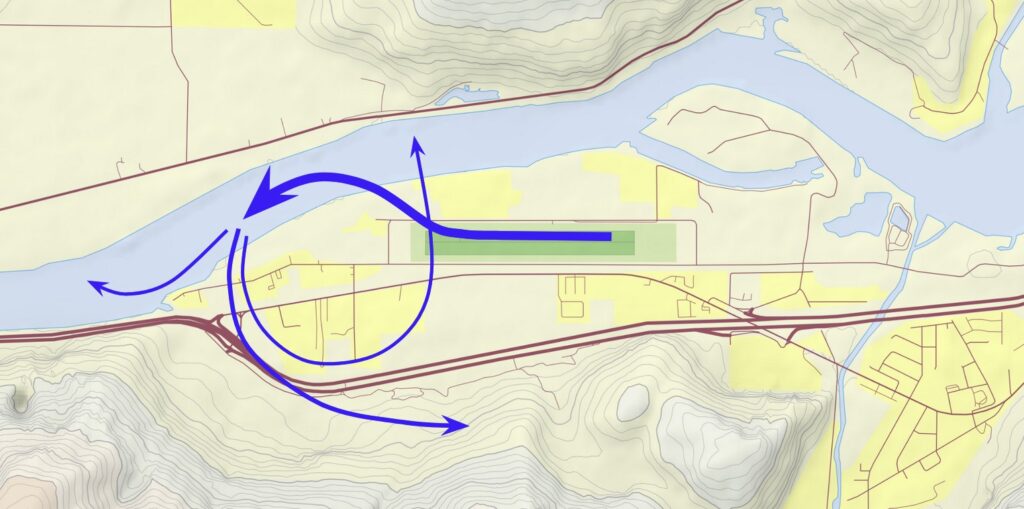 Aerotow departures from Runway 25R start with a slight right turn followed by a left turn over the Fraser River. Most aerotows continue close along the mountain ridge south of CYHE, but others may turn right from the Fraser River or continue turning left to cross over the airfield. Aerotow departures from Runway 07L may track right of centreline before turning left over the Fraser River.