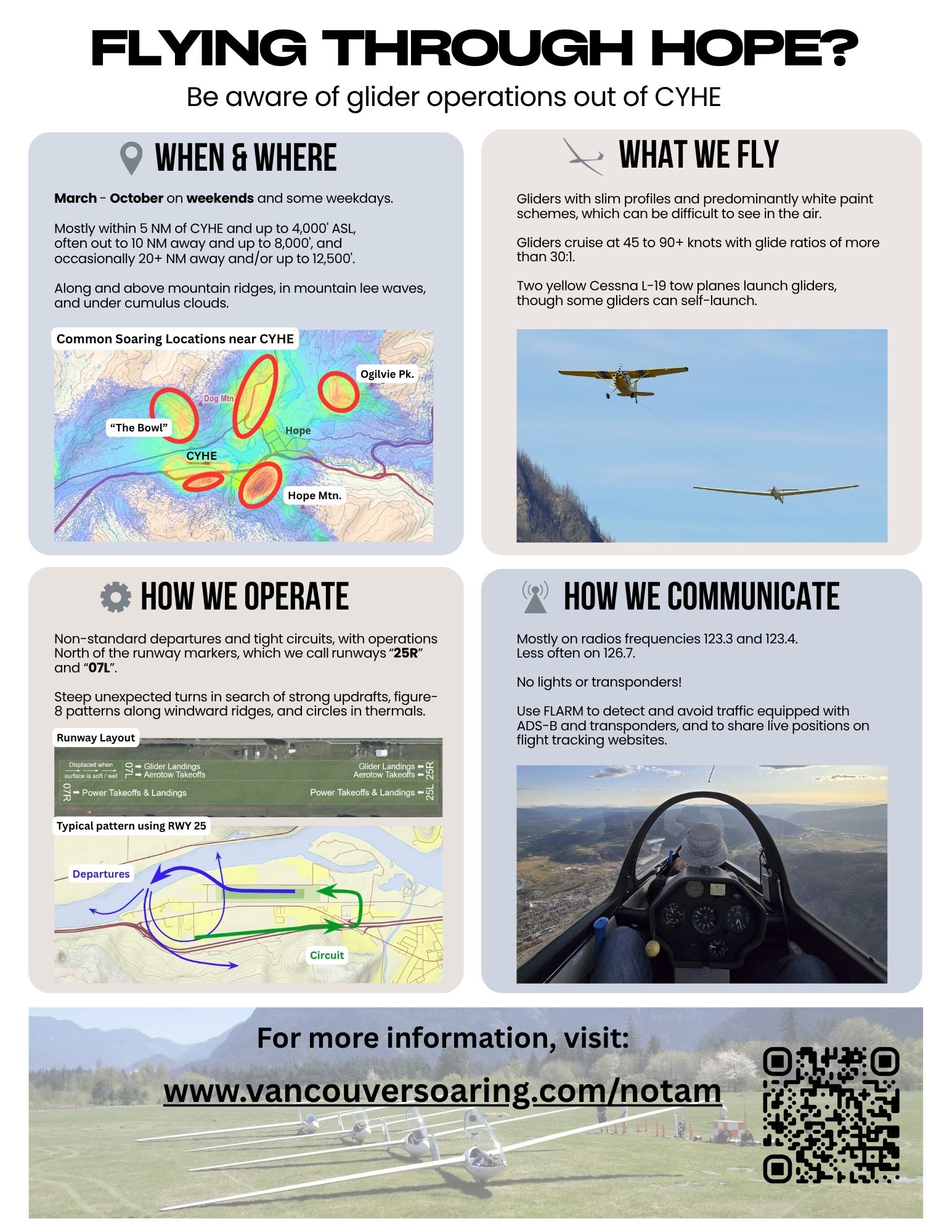 This page is for pilots, air traffic controllers, and anyone else who is involved in any flight operations in the vicinity of Hope BC (CYHE). Read on to learn about our gliding activity to help each other to stay safe.